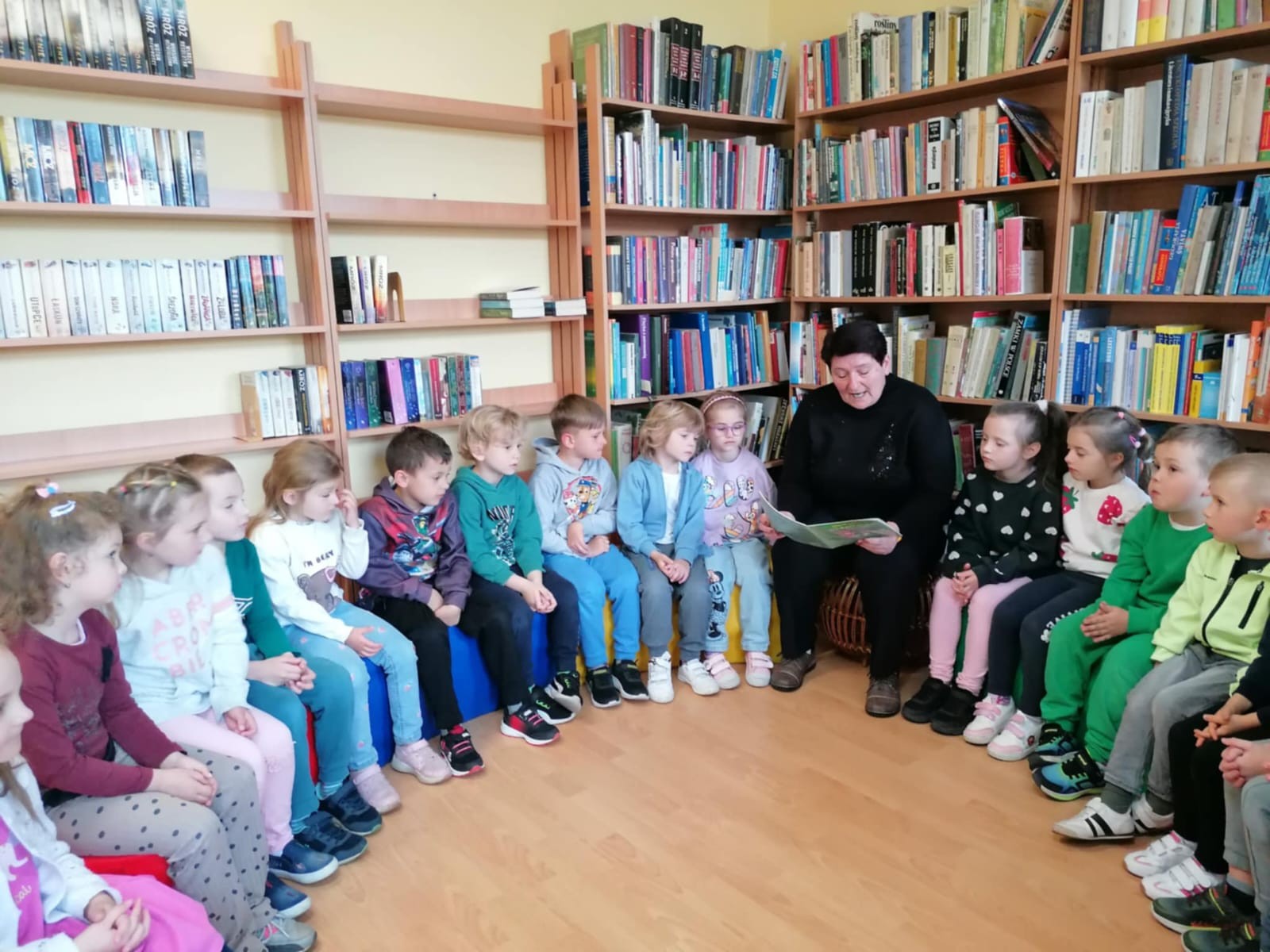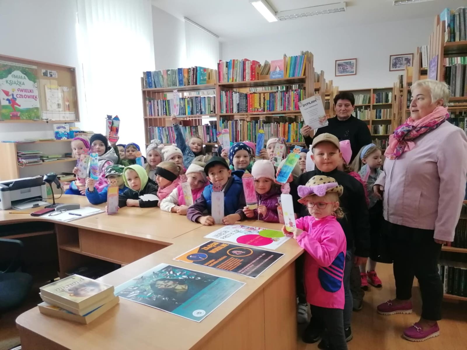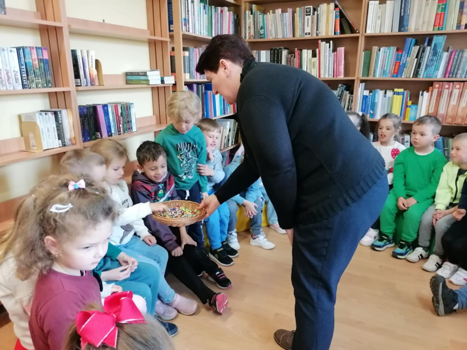 Z okazji Dnia Bibliotekarza postanowiliśmy wybrać się do biblioteki. Pani opowiedziała nam o pracy bibliotekarza, o tym, jak należy się zachowywać w bibliotece, jak pożyczać książki i jak o nie dbać. Przeczytała nam również bajkę pt. „Kamyczek w bilbiotece”. Na zakończenie Pani oprowadziła dzieci po bibliotece; dzieci mogły wybrać sobie książki, które je zainteresowały i je pooglądać. Bardzo dziękujemy za miłe spotkanie i poświęcony nam czas!