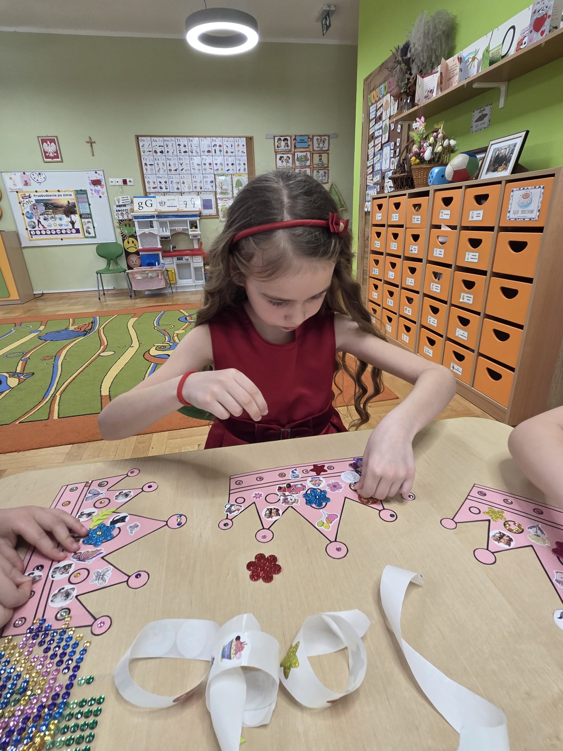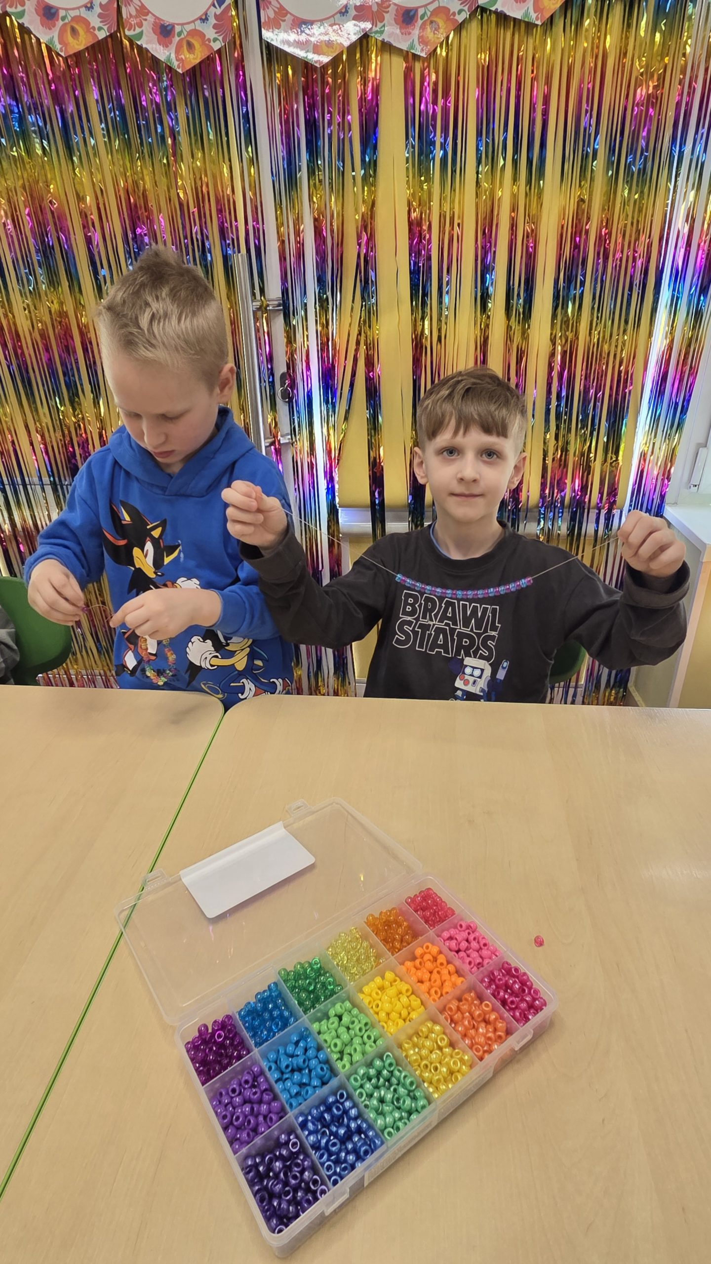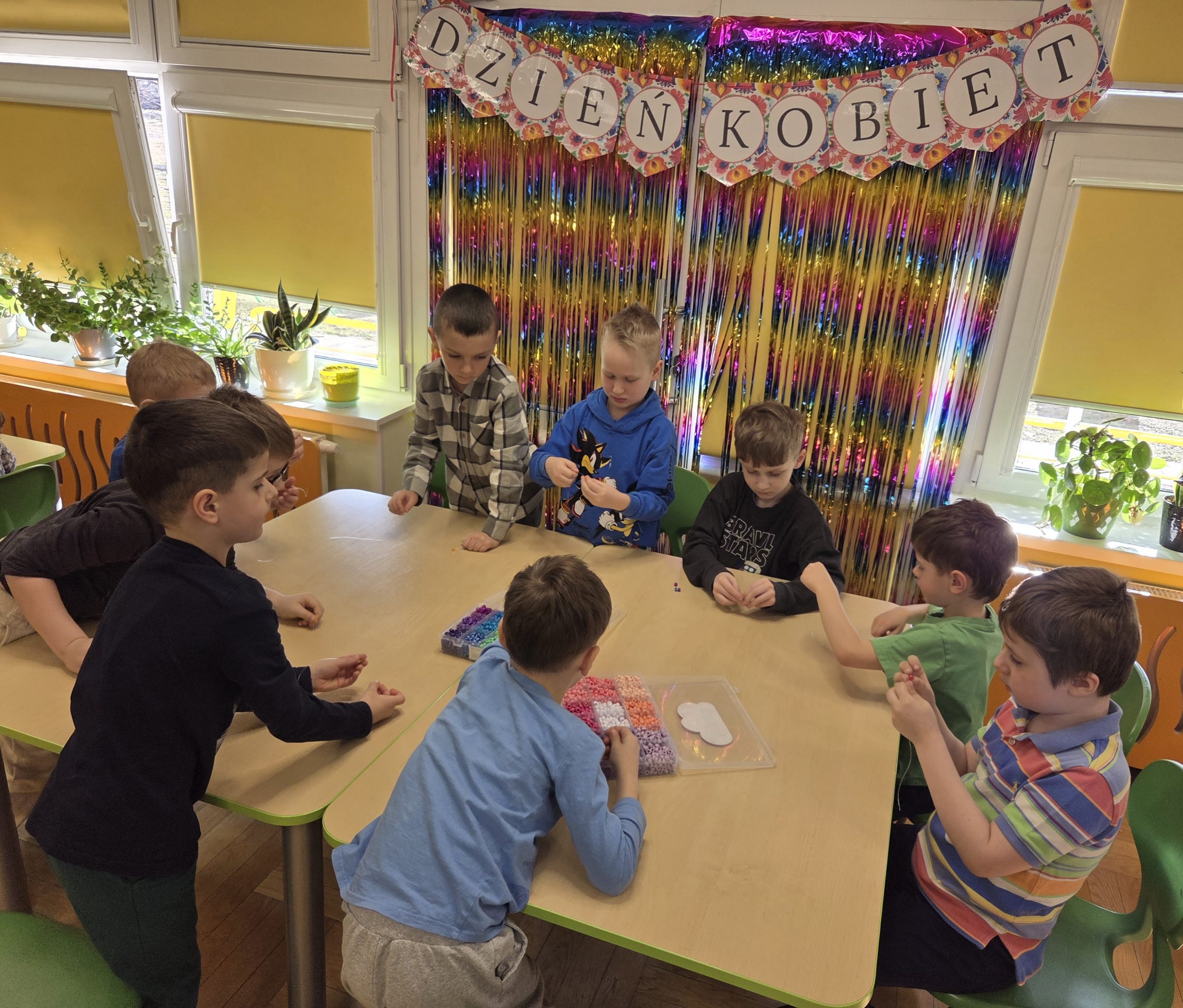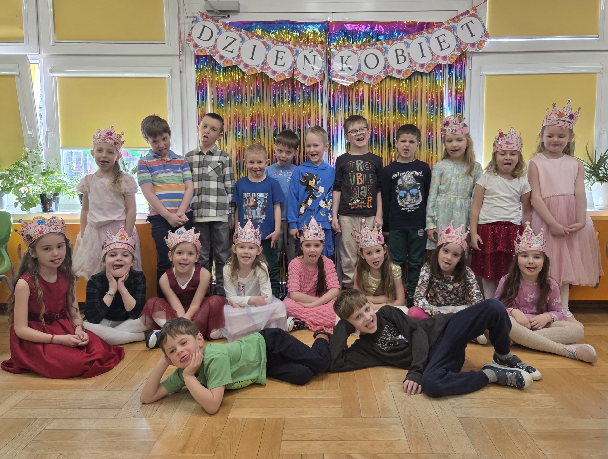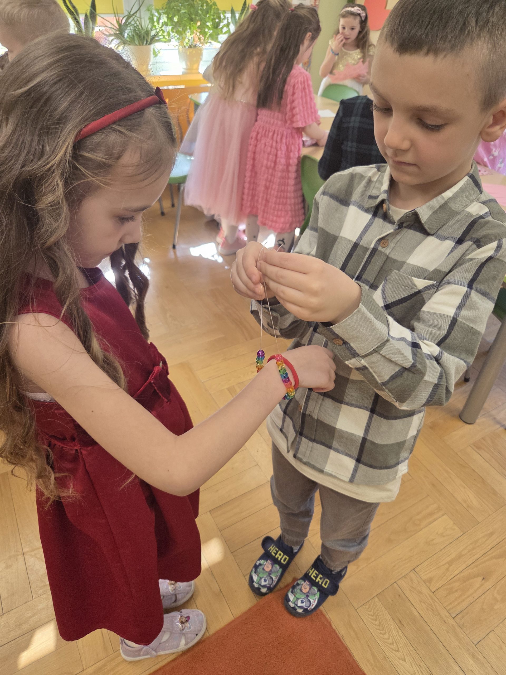 Dzisiaj w naszej grupie świętowaliśmy Dzień Kobiet w radosnej i twórczej atmosferze. Chłopcy z dużym zaangażowaniem przygotowywali dla dziewczynek i pań piękne bransoletki z koralików. Dziewczynki natomiast ozdabiały kolorowe korony, dzięki którym mogły poczuć się jak prawdziwe księżniczki. Nie zabrakło także świetnej zabawy przy piniacie – dziewczynki dzielnie w nią uderzały, zdobywając pyszne cukierki. Na zakończenie wszystkie dziewczynki otrzymały drobne prezenty, a chłopcy słodkie wafelki. To był bardzo miły i pełen uśmiechów dzień.