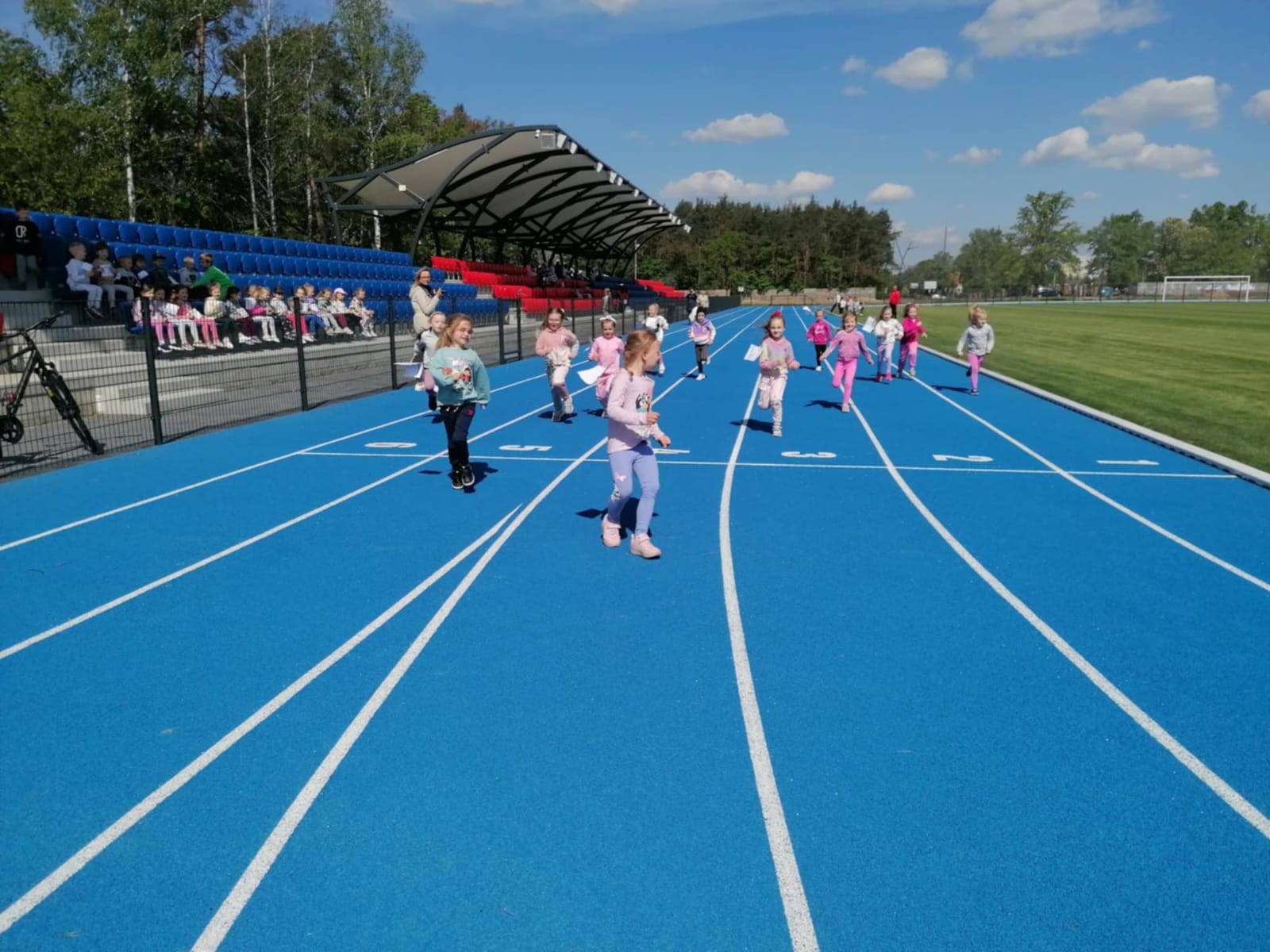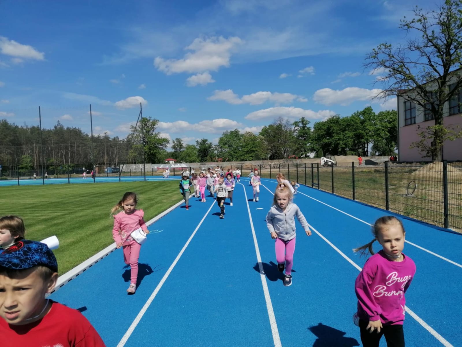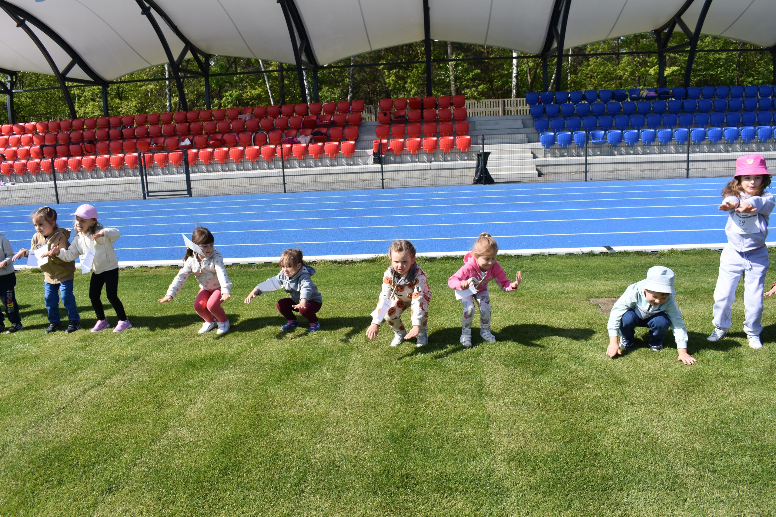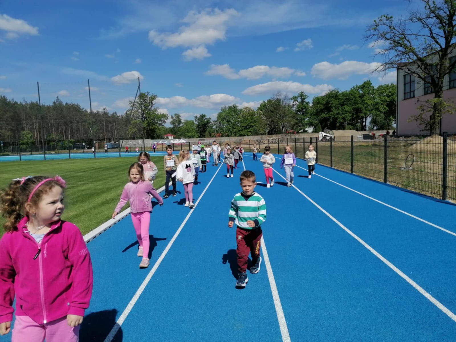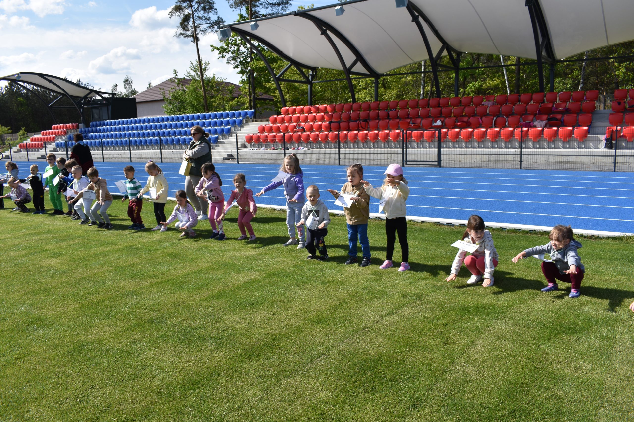 Na zaproszenie Panów trenerów z MOSiR w dniu dzisiejszym wybraliśmy się na stadion, aby wziąć udział w biegu pod hasłem „Sprintem do maratonu”. Naszą wizytę rozpoczęliśmy od rozgrzewki a następnie dzieci pełne energii ruszyły do biegu, pokonując wyznaczoną trasę. Celem wydarzenia jest promocja zdrowego stylu życia i aktywnego spędzania czasu, w tym czasu na świeżym powietrzu, popularyzowanie biegów wśród dzieci oraz kształtowanie u przedszkolaków nawyku podejmowania aktywności fizycznej w dorosłym życiu. Panom trenerom dziękujemy za zorganizowanie biegu i gratulujemy wszystkim uczestnikom maratonu, zawsze pamiętając, że sport to zdrowie!