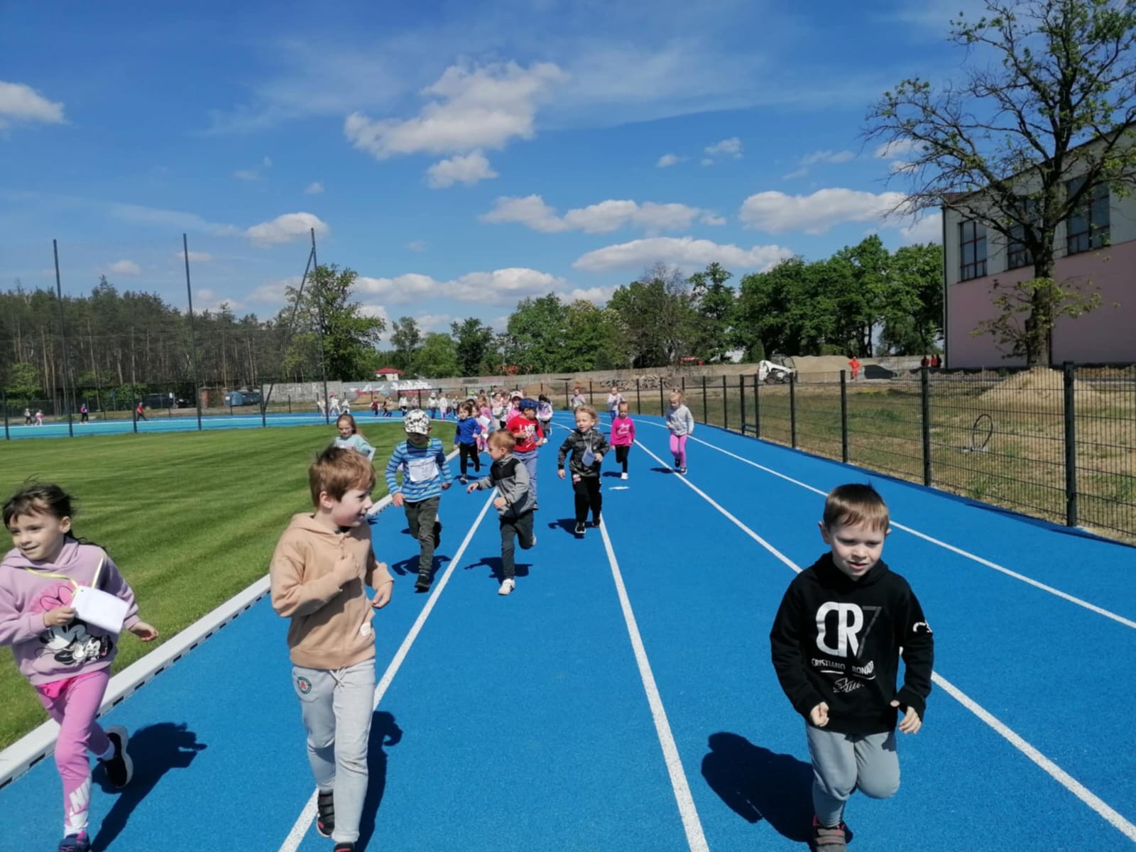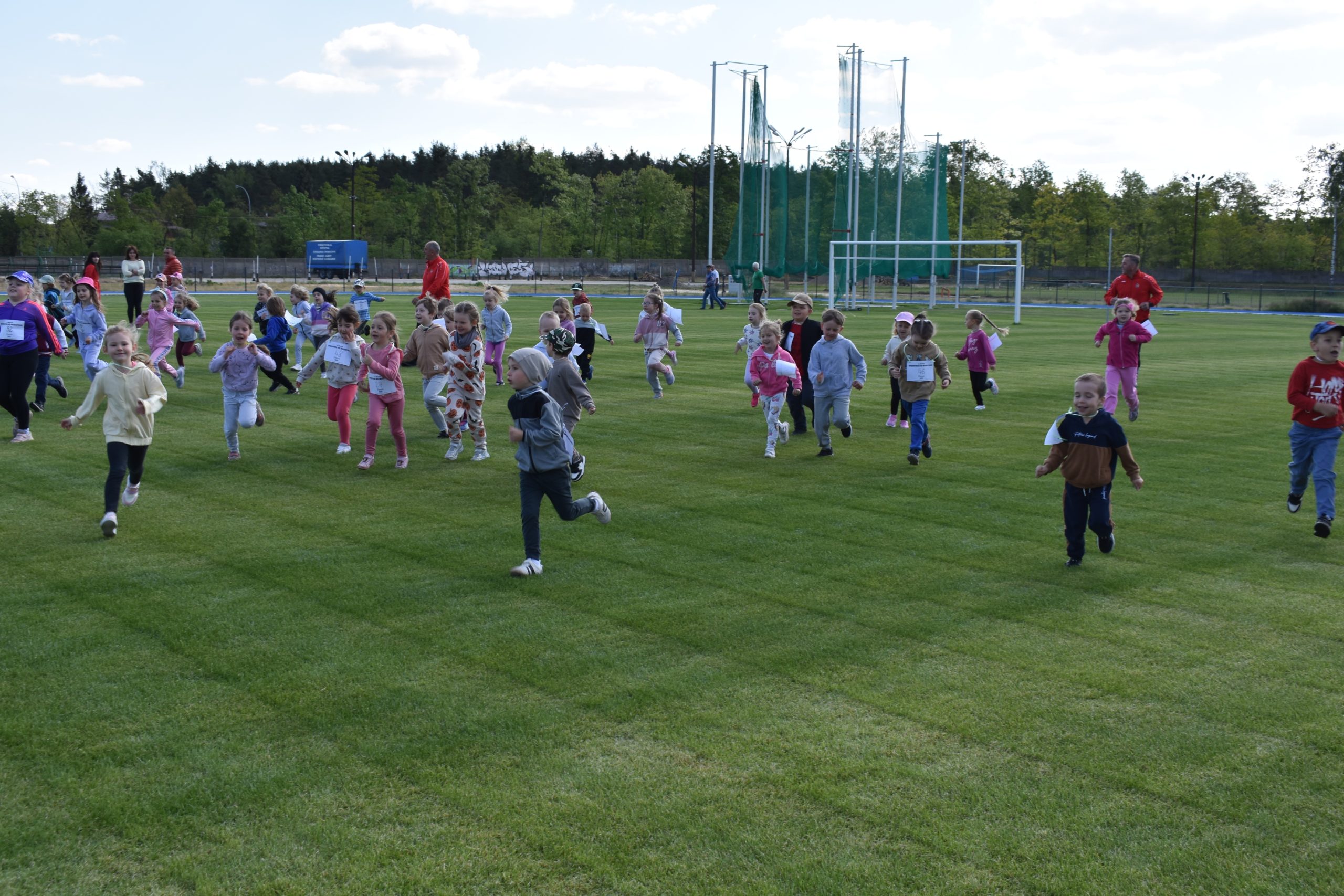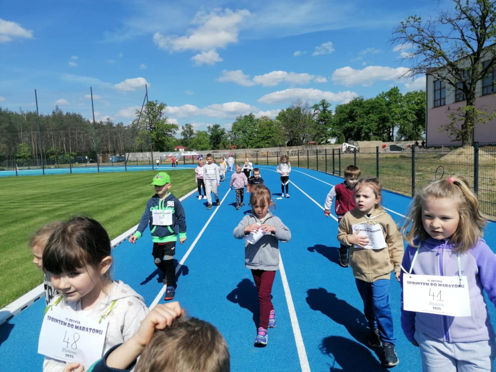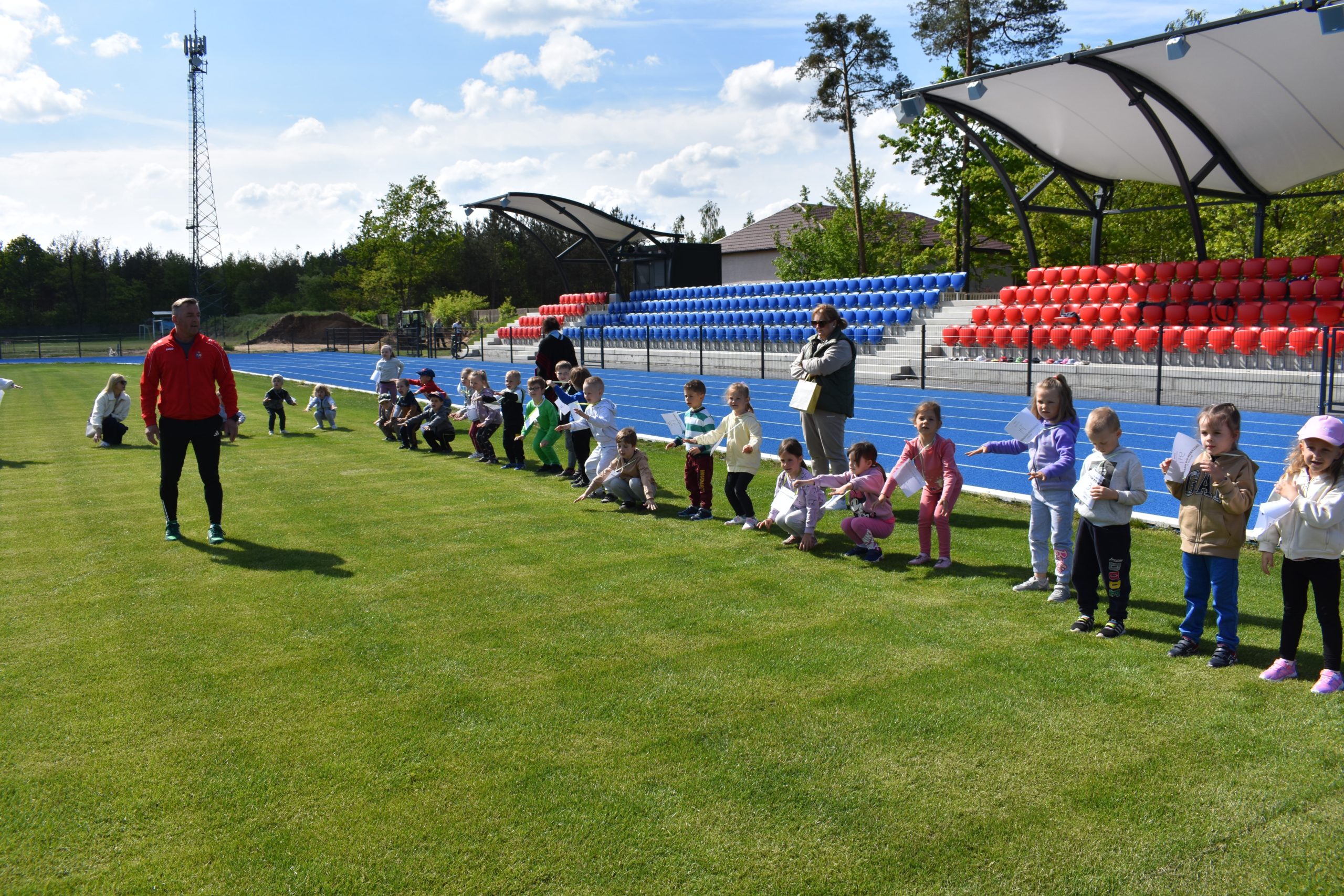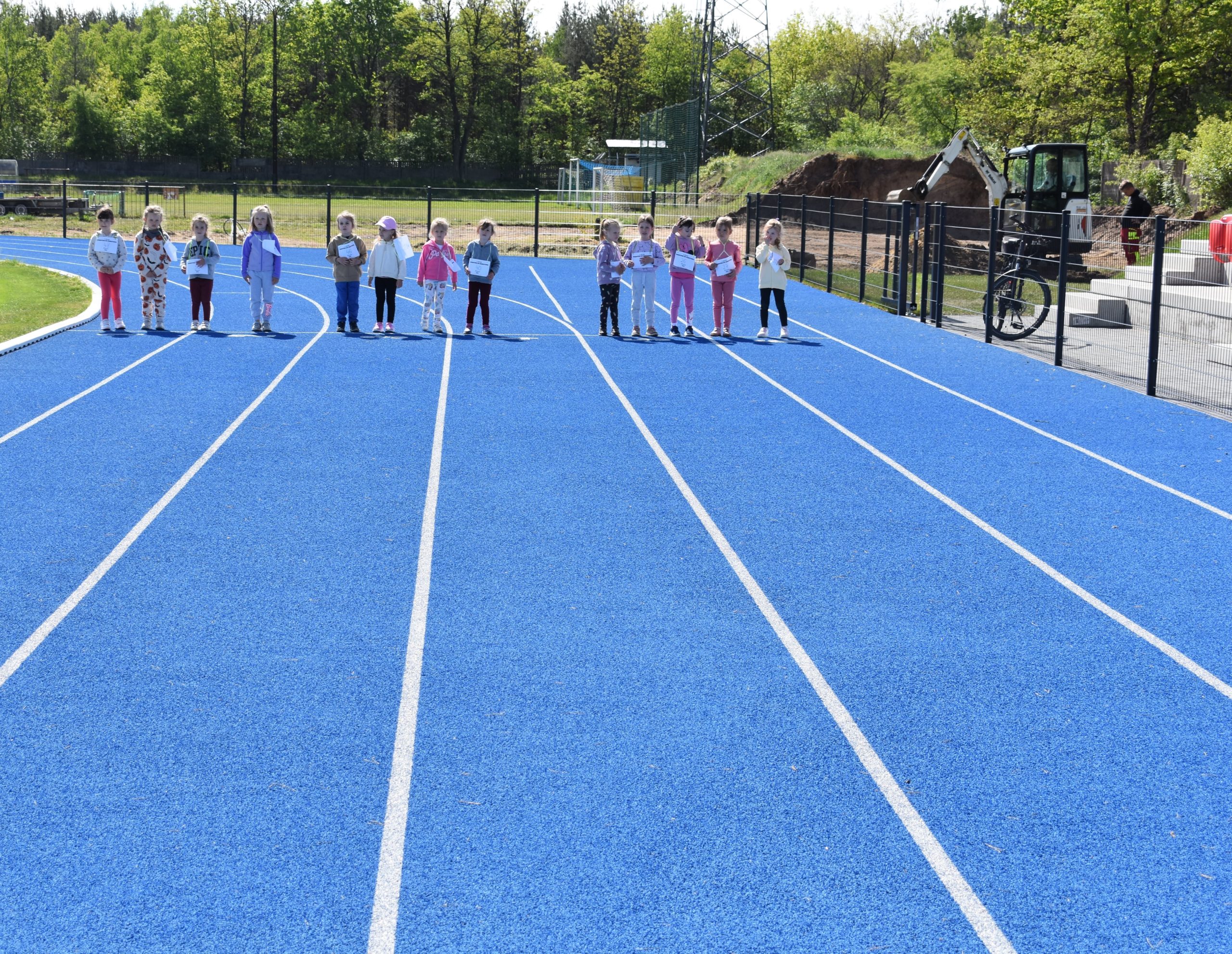 Na zaproszenie Panów trenerów z MOSiR w dniu dzisiejszym wybraliśmy się na stadion, aby wziąć udział w biegu pod hasłem „Sprintem do maratonu”. Naszą wizytę rozpoczęliśmy od rozgrzewki a następnie dzieci pełne energii ruszyły do biegu, pokonując wyznaczoną trasę. Celem wydarzenia jest promocja zdrowego stylu życia i aktywnego spędzania czasu, w tym czasu na świeżym powietrzu, popularyzowanie biegów wśród dzieci oraz kształtowanie u przedszkolaków nawyku podejmowania aktywności fizycznej w dorosłym życiu. Panom trenerom dziękujemy za zorganizowanie biegu i gratulujemy wszystkim uczestnikom maratonu, zawsze pamiętając, że sport to zdrowie!