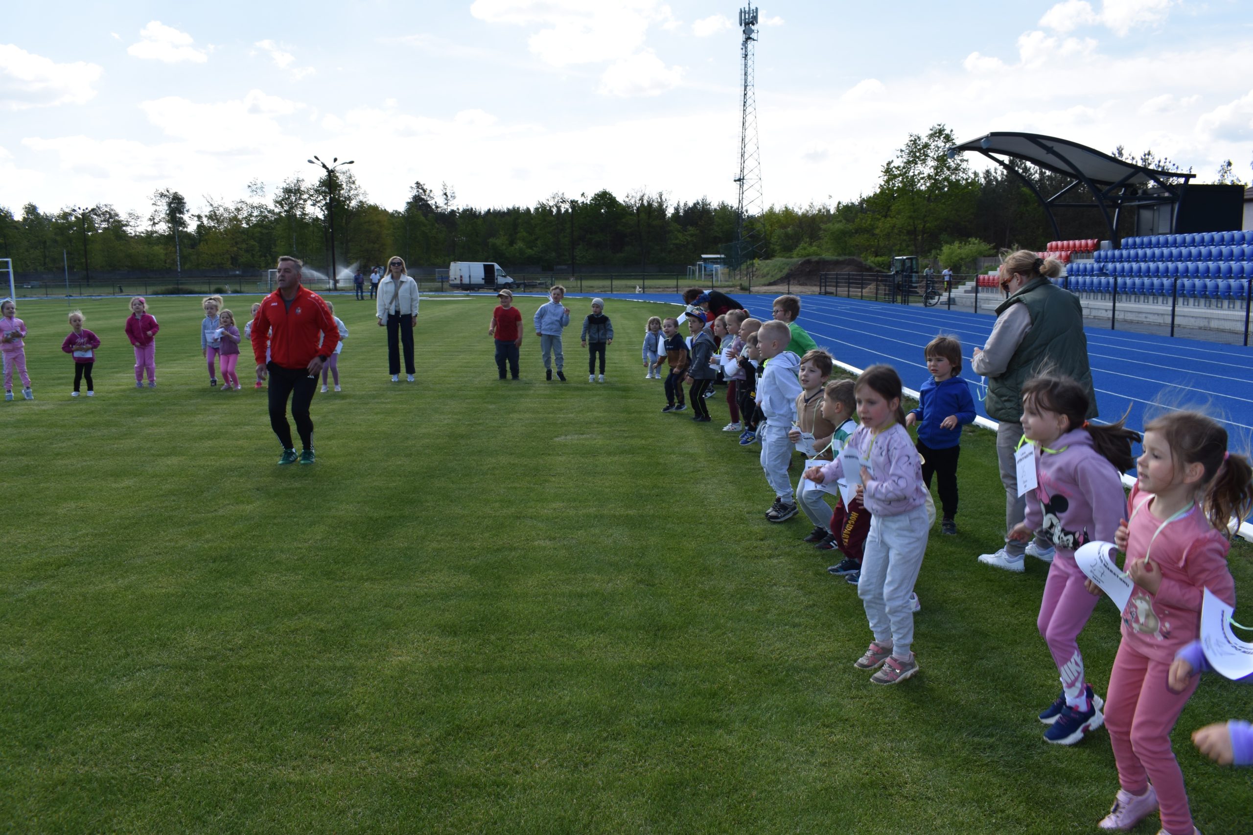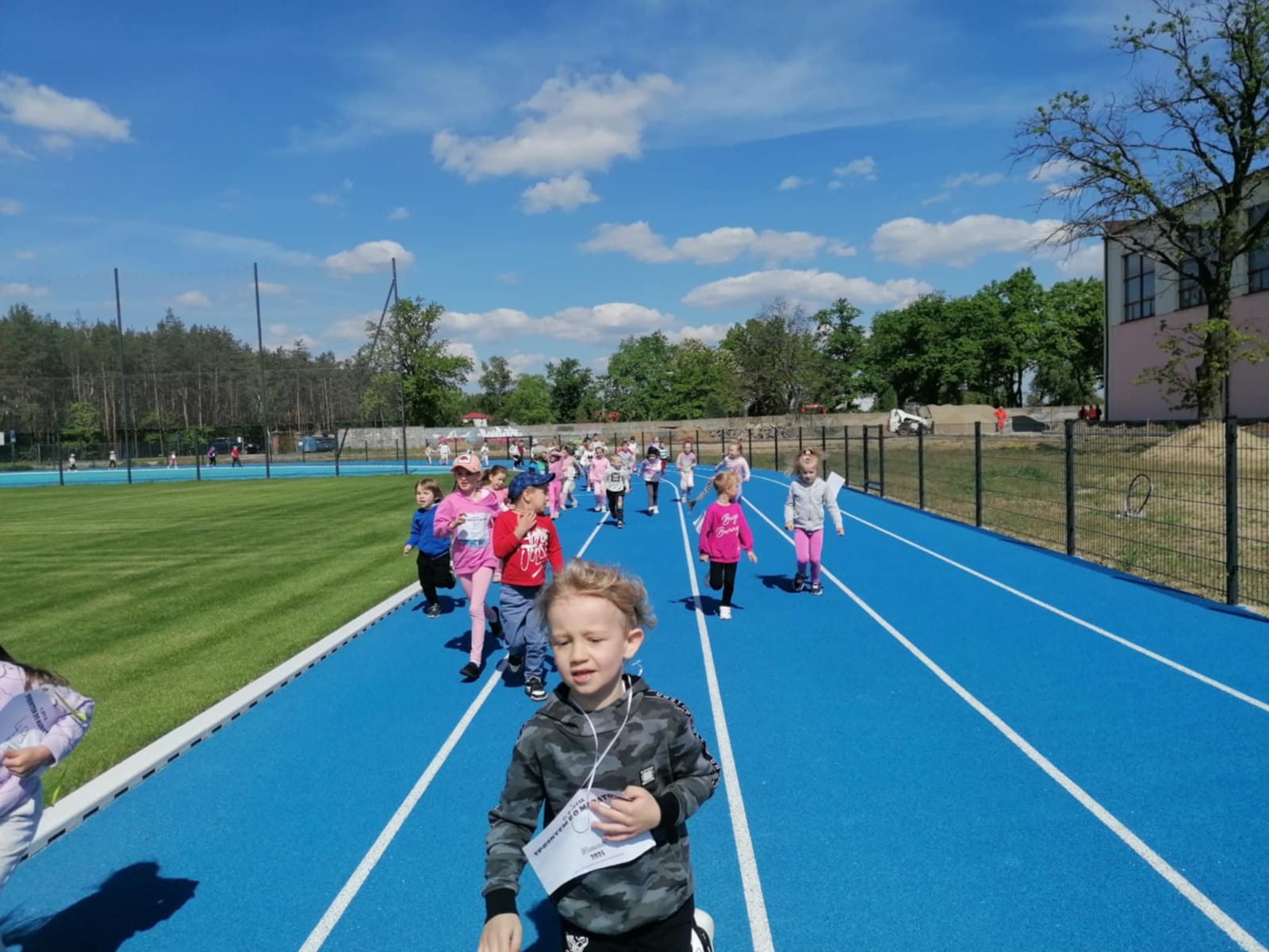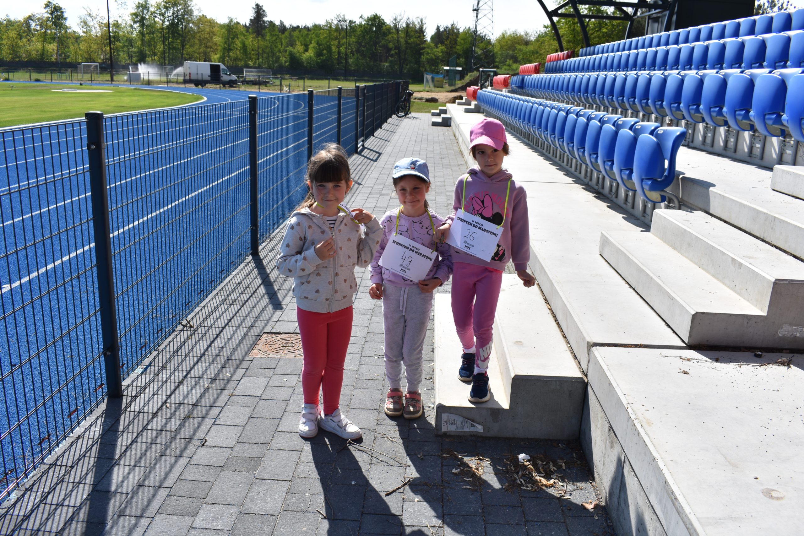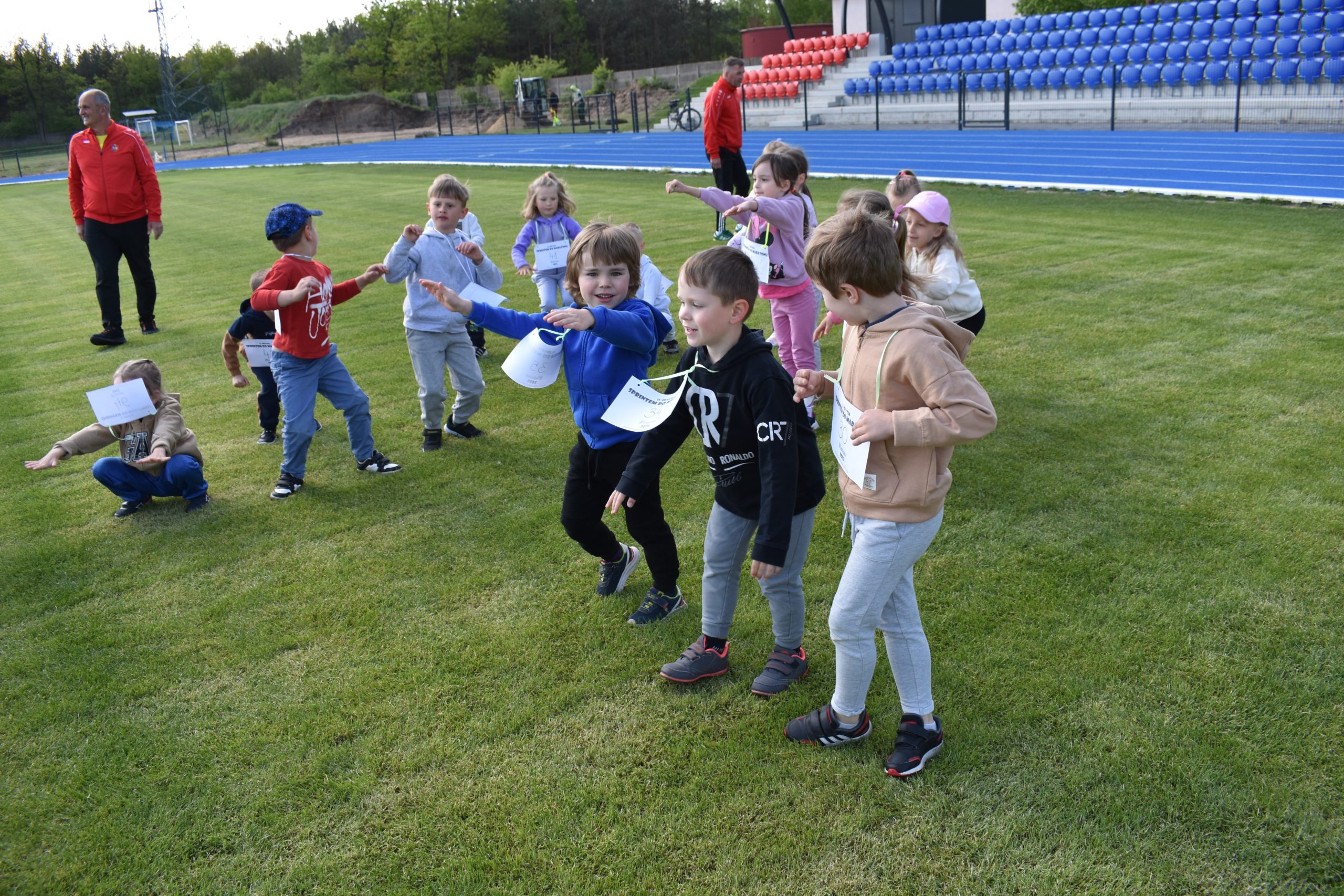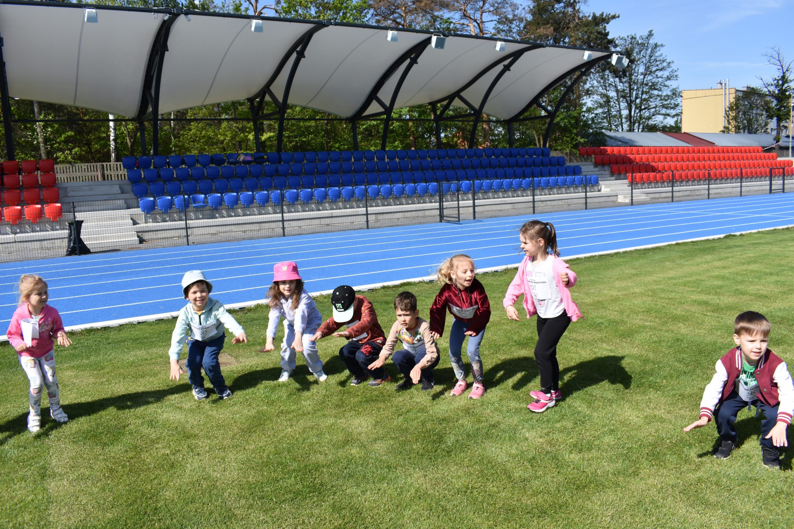 Na zaproszenie Panów trenerów z MOSiR w dniu dzisiejszym wybraliśmy się na stadion, aby wziąć udział w biegu pod hasłem „Sprintem do maratonu”. Naszą wizytę rozpoczęliśmy od rozgrzewki a następnie dzieci pełne energii ruszyły do biegu, pokonując wyznaczoną trasę. Celem wydarzenia jest promocja zdrowego stylu życia i aktywnego spędzania czasu, w tym czasu na świeżym powietrzu, popularyzowanie biegów wśród dzieci oraz kształtowanie u przedszkolaków nawyku podejmowania aktywności fizycznej w dorosłym życiu. Panom trenerom dziękujemy za zorganizowanie biegu i gratulujemy wszystkim uczestnikom maratonu, zawsze pamiętając, że sport to zdrowie!